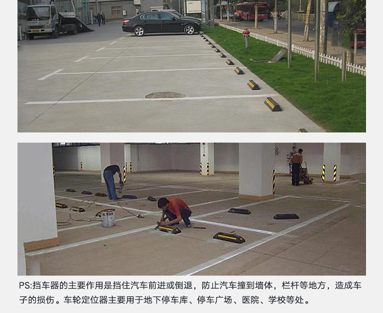 車輪定位器又稱車輪擋輪器、倒車墊、阻位器、擋車器等,橡膠車輛定位器用于停車場和車庫,在車輛停車入位時,輪胎觸及定位器,使車輛準確、整齊的停在車位上。車輪定位器安 裝在停車位后方以限定車輛準確停放到最佳位置,橡膠不會損壞汽車輪胎,比起鐵制品更安 全耐用且永不生銹,醒目美觀,安 裝方便。坡體有一定柔軟度,可以使車輛減輕對輪胎的磨損,是目前限定車輛準確停放位置的最佳設施。