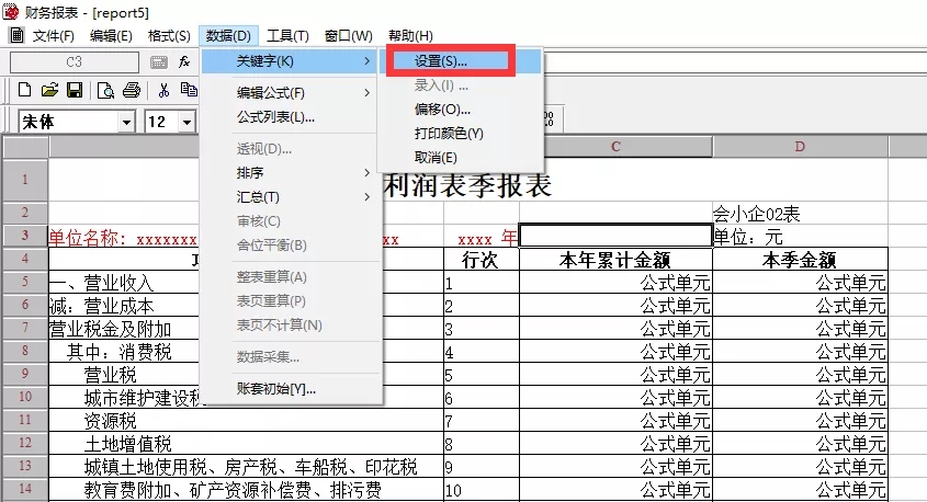 確定行業性質之后,打開【財_務_報表】,點擊【文件】-【新建】,選擇利潤表和對應的行業性質為小企業會計準則(2013),在【格式】狀態下,把【本月金額】改為【本季金額】,利潤表標題改為【利潤表季報表】,如下圖所示: