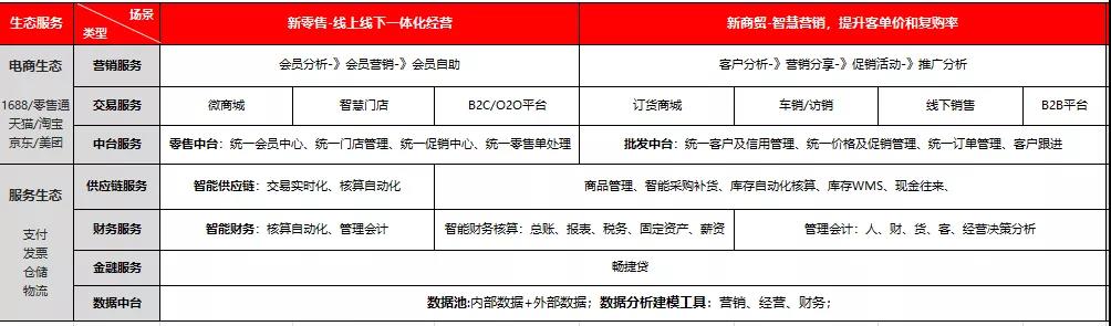 在面向新零售企業(yè)提供的營銷類服務(wù)_中,營銷前端包括微信營銷、會員分析、會員自助等服務(wù)_,交易場景包括微商城、智慧門店、b2c/o2o平臺等。在面向新商貿(mào)企業(yè)提供的營銷類服務(wù)_,營銷前端包括客戶分析、營銷分享、促銷活動與推廣分析等服務(wù)_,交易場景則包括訂貨商城、車銷訪銷、線下銷售、b2b平臺等。