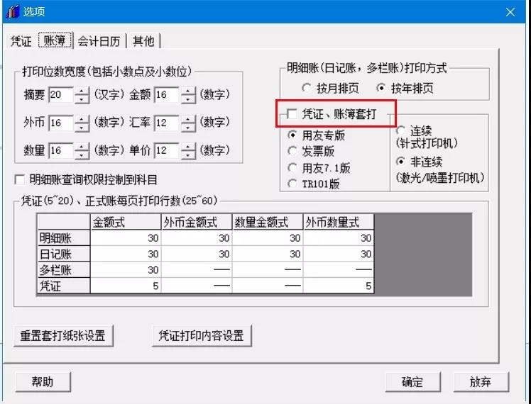 2、打印設置步驟:依次點擊,總賬-設置-選項-賬簿-憑證賬簿套打(不勾選),確定;