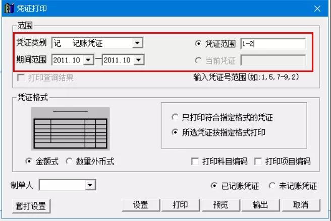 設置好要打印憑證的范圍,這里選的是記賬憑證,10月份的1-2號憑證,測試打印使用。點擊【設置】
