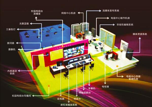 校園電視臺(tái)主要由演播室、視頻、音頻、導(dǎo)播切換虛擬系統(tǒng)、錄制編輯系統(tǒng)和網(wǎng)絡(luò)流發(fā)布平臺(tái)、媒體資源管理系統(tǒng)幾大部分組成。校園級(jí)別的電視臺(tái)一般來(lái)說(shuō)屬于民用級(jí)別,各個(gè)學(xué)校根據(jù)財(cái)力和需求的不同所需設(shè)備不盡相同。