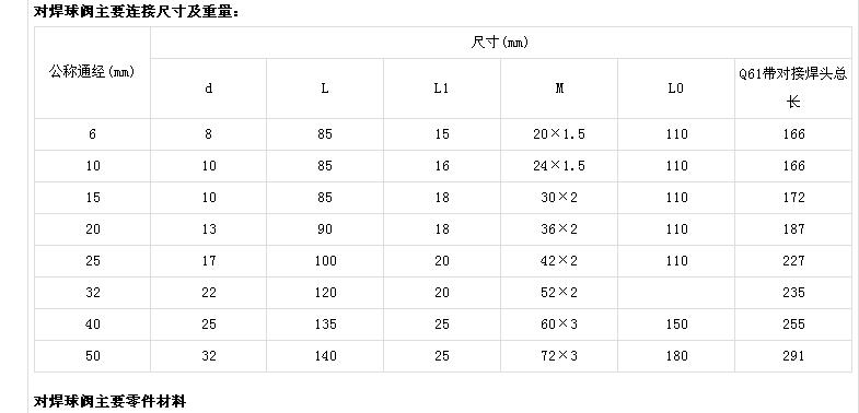 產品名稱:對焊球閥產品型號:q61f產品口徑:dn6-50產品壓力:0.6-6.4mpa產品材質:鑄鋼、不銹鋼、合金鋼等產品簡介:制造標準:中國gb、機械部jb、化工標準hg、美標api、ansi、德標din、日本jis、jpi、英標bs生產。閥體材質:銅、鑄鐵、鑄鋼、碳鋼、wcb、wc6、wc9、20#、25#、鍛鋼、a105、f11、f22、不銹鋼、304、304l、316、316l、鉻鉬鋼、低溫鋼、鈦合金鋼等。工作壓力1.0mpa-50.0mpa。工作溫度:-196℃-650℃。連接方式:內螺紋、外螺紋、法蘭、焊接、對焊、承插焊、卡套、卡箍。驅動方式:手動、氣動、液動、電動。上海惠夏閥門有限公司擁有全球最頂尖的生產設備和技術工程師,有能力按照各國標準以及各種行業標準生產制造優質閥門。聯系電話:15901687301 產品詳情對焊球閥主要連接尺寸及重量: