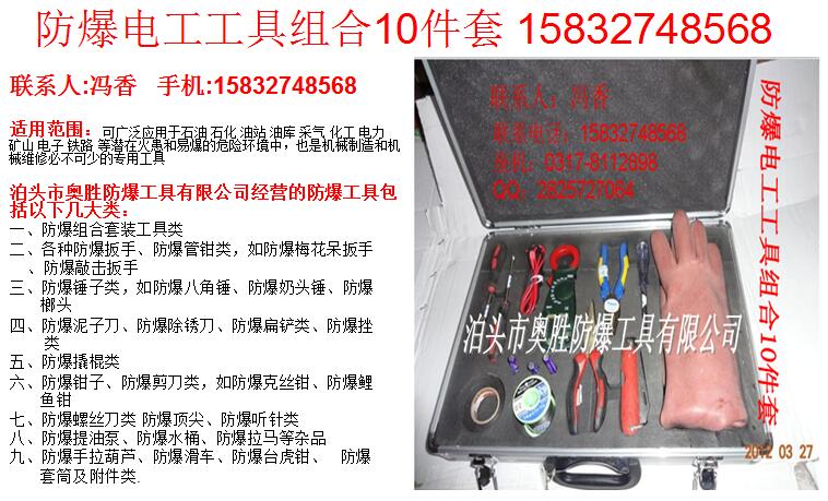 泊頭市奧勝防爆工具有限公司,專業生產,專門針對石油管道,化工管道,液化氣管道,搶險維護,維修堵漏設計生產的防爆組合工具:遼寧zhdg19/27/38/4650防爆電工工具組合10件深受廣大客戶好評。公司專業供應防爆工具,防爆組合工具箱:遼寧zhdg19/27/38/4650防爆電工工具組合10件,防爆防靜電工具,防爆呆扳手,防爆梅花扳手,防爆活扳手,防爆管鉗,防爆鉗,防爆螺絲刀,防爆八角錘,防爆錘,防爆開口扳手,防爆敲擊扳手,防爆閥門扳手,防爆絲刷,防爆刀,防爆鏟等各種防爆工具,專用工具,組合工具箱等。