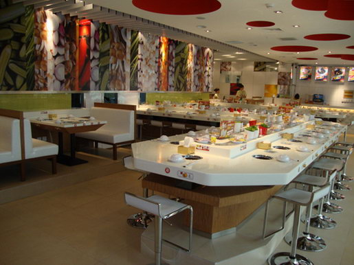 回轉設備可根據餐店使用面積及客戶要求進行設計,我公司設備傳動系統采用密封式設計,輸送連帶結構嚴謹,運行安 全平穩,符合食品衛生要求。可以節省人力物力,客人在各自的座位上可隨意選擇擺放在輸送帶上的食物,無需服務員送上,同樣回轉輸送設備以其美觀、時髦、新奇、動感吸引著更多的顧客,使青少年所青睞。