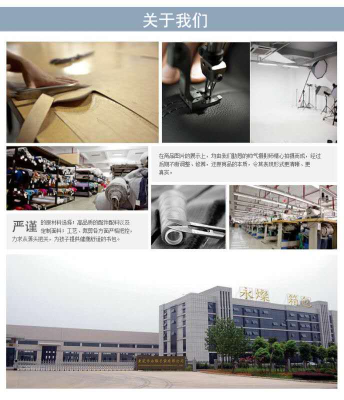 廣東永燦手袋是一家集設計、訂制、生產學生書包、旅行包、背包、以及其他箱包手袋的訂制廠家。創建于2002年,位于東莞市橫瀝鎮金馬路,占地5500平方米,國內的永燦書包品牌youngsunstar主打生產孩子的學生書包,筆袋,ipad袋,挎包,背包等。