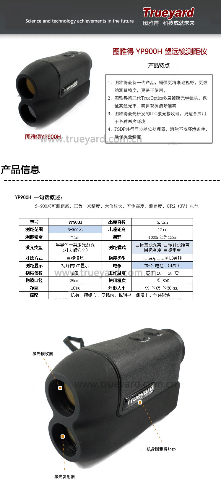 trueyard圖雅得yp900h望遠鏡測距儀,是yp系列的高級別機型,提供900米的測量距離。在測量精度,觀測效果采用了trueyard的2010年最新科技技術。讓您真正擁有一款高精度易使用的測距儀。