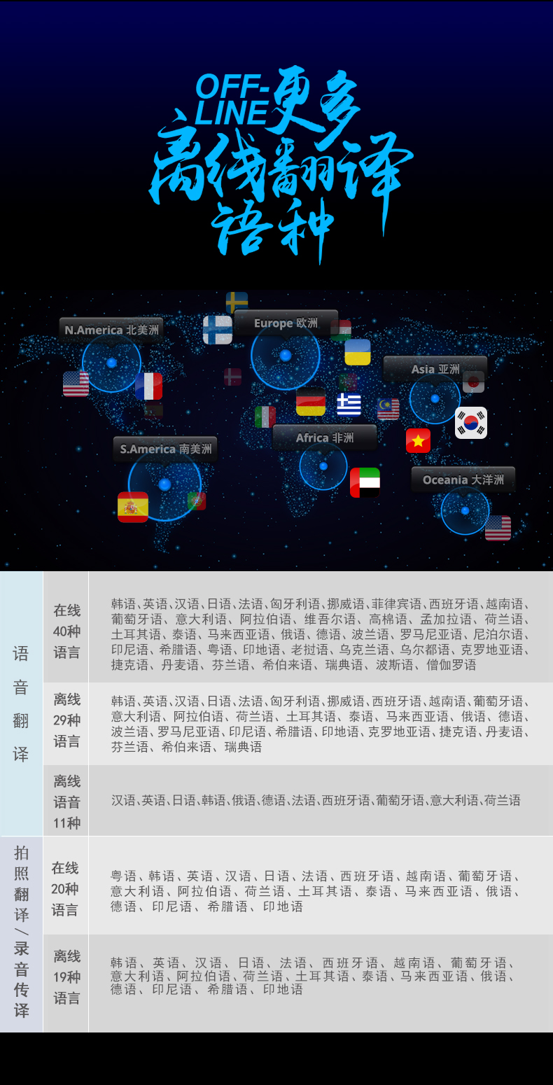 本翻譯機(全球譯v100升級版)新版是2018年9月2日上市的,支持電話遠程翻譯,可以翻譯40種語言:英語, 德語, 法語, 日語, 韓語, 俄語, 西班牙語, 葡萄牙語, 意大利語, 阿拉伯語, 中文, 荷蘭語、印尼語、越南語、土耳其語、泰語、馬來西亞語、希臘語、印地語、粵語(香港)、克羅地亞,捷克語,丹麥 語,芬蘭語,希伯來語,匈牙利語,挪威語,波蘭語,羅馬尼亞,瑞典語,維吾爾語,高棉語,老撾語。可以離線翻譯、離線對話、拍照翻譯、錄音傳譯等功能。
