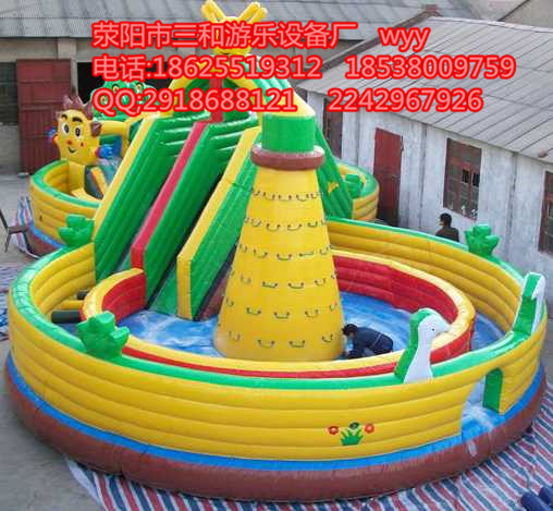 大型充氣城堡游樂園屬新一代的娛樂設施,根據兒童的特性設計,它內含滑梯、各式各樣的動物造型,有豐富的娛樂項目,深受孩子們的喜愛。它具有安 全性、綜合性、可觀賞性、新穎性,色彩鮮明,經久耐用通過科學的立體組合,采用超強的防水布制作而成,這是一種綜合性極強的娛樂樂園。游戲者通過翻、滾、爬、搖、晃、跳、鉆等新奇的活動方式,達到開發智力,鍛煉身體,愉悅身心的目的。本產品因其隨意性和無動力裝置受到買家的歡迎,安 全可靠,管理簡單,維修方便。