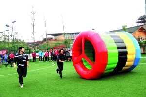 比賽方法:1人金五環(huán)內(nèi),兩人掌握方向,一人在后方推,賽程30米,往返一次,用時(shí)***短者為勝。