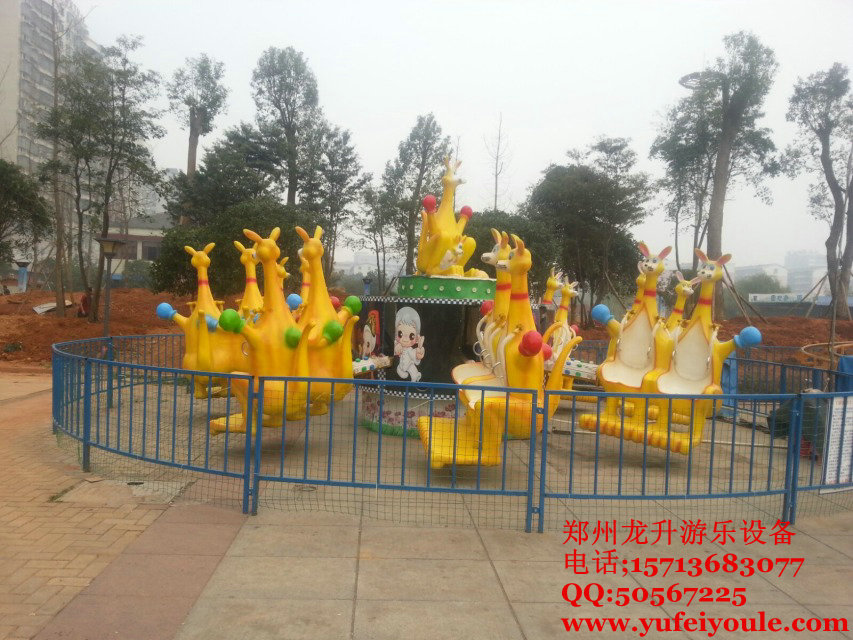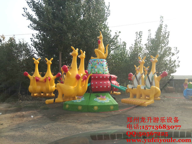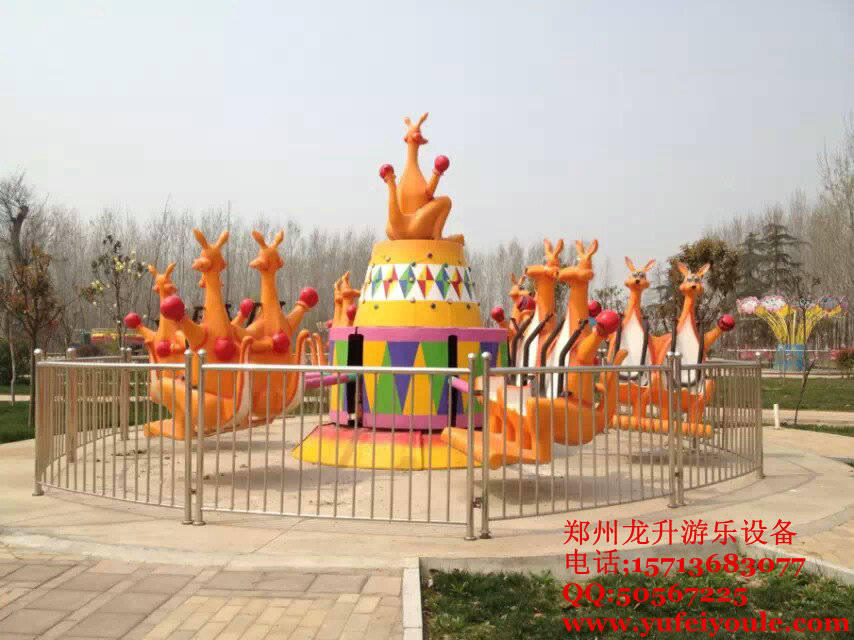 歡樂袋鼠”是一款以彈跳形式前進的彈跳機系列產品,在“狂車飛舞”游樂設施基礎上更進一步開發的新型游樂設備,乘客乘坐在袋鼠造型的座椅上,隨著節奏蹦跳起伏,