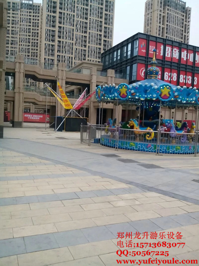 海洋樂園擁有富麗堂皇的外觀,精美華麗的裝飾內涵,磅礴的氣勢,絢麗的燈飾和高貴典雅的造型,猶如一頂旋轉的皇冠。當上下層旋盤正反方向旋轉的時候,游客乘坐在色彩斑斕,形態各異的海洋動物上奔騰跳躍,四蹄生輝,仿佛 置身仙境般的童話海洋世界,瞬間的夢想由此開始向無窮的天際放飛。能夠睜大孩子們羨慕的眼光,讓音樂永遠不離場,是否你也想來這里暢想?