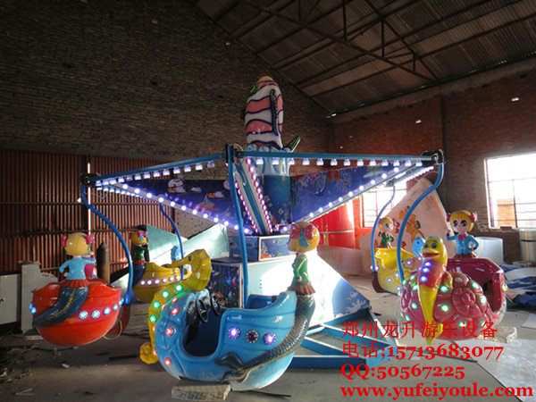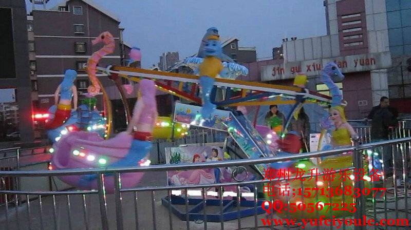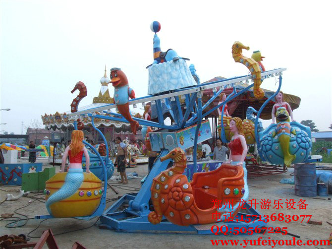 "海洋漫步"是在桑巴氣球和搖頭飛椅的基礎上精心改良的一款中小型兒童游樂設備.以神秘的海洋做為背景,又將神秘、優(yōu)美的美人魚;人類的好朋友——調(diào)皮的海豚,可愛的海螺、海馬、小貝殼等等海洋生物呈現(xiàn)在在家眼前,加上傾斜、起伏的運動軌跡設計,帶領著大家漫步在海洋之中,以海豚為伴,以美人魚為友,感覺著海洋的無窮魅力和擋不住的吸引力。