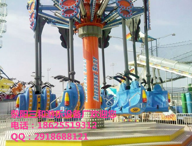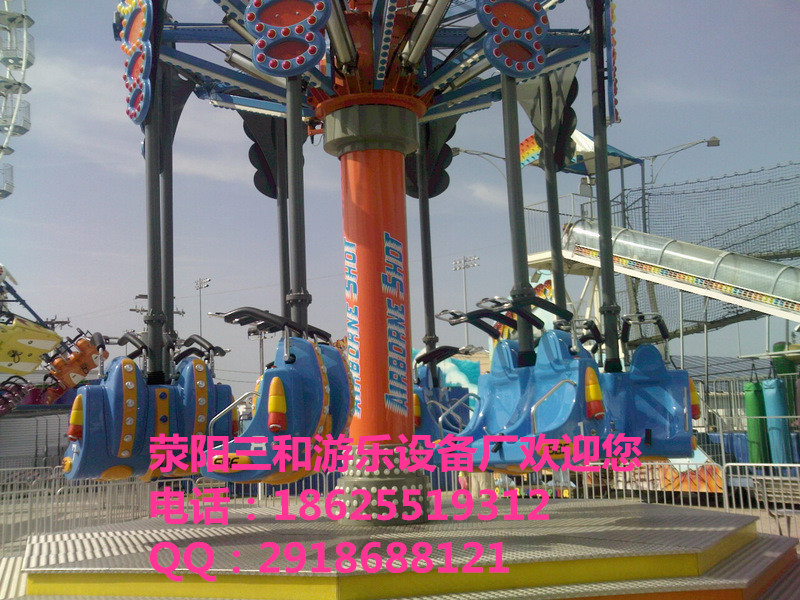 空中射擊是三和游樂設備廠最新從國外引進的一種新型游樂設備。該游樂設備類似于我國的飛椅,但是比飛椅的趣味性更強。不僅在空中旋轉而且可以按按鈕達到射擊的效果。