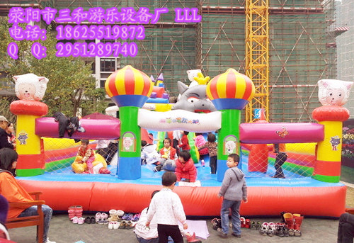 充氣城堡是一種新型的兒童游樂設備,該設備用離心風機吹的長拉力和薄膜內外的氣壓形成形狀的玩具,具有造型多樣,顏色艷麗,趣味性強以及攜帶方便等特點,其豐富多樣的造型及艷麗的外表深受兒童的喜愛,常見的充氣玩具有卡通造型充氣城堡大型的充氣滑梯等等!