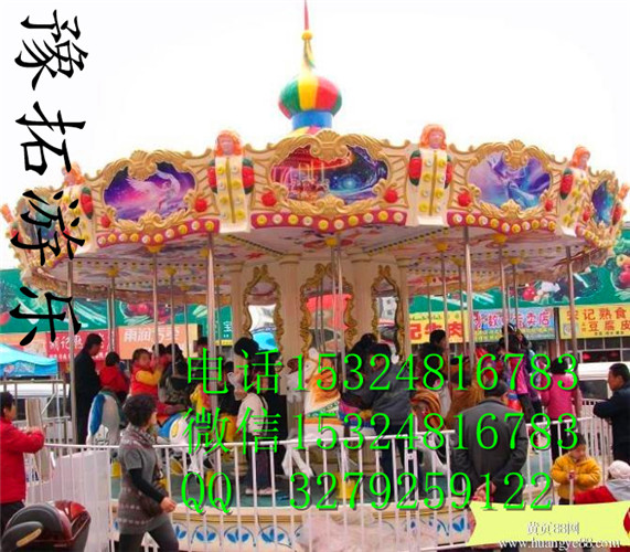 豫拓游樂“豪華轉馬”游藝機是模擬跑馬廳的娛樂活動而設計的,該游藝機的上部設有彩色的錐形頂