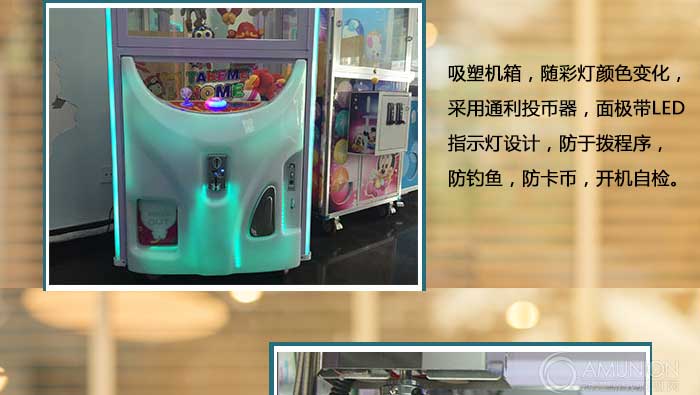 1、吸塑燈箱,隨彩燈顏色變化,采用通利投幣器,面極帶led指示燈設計,防于撥程序,防釣魚,防卡 幣,開機自檢