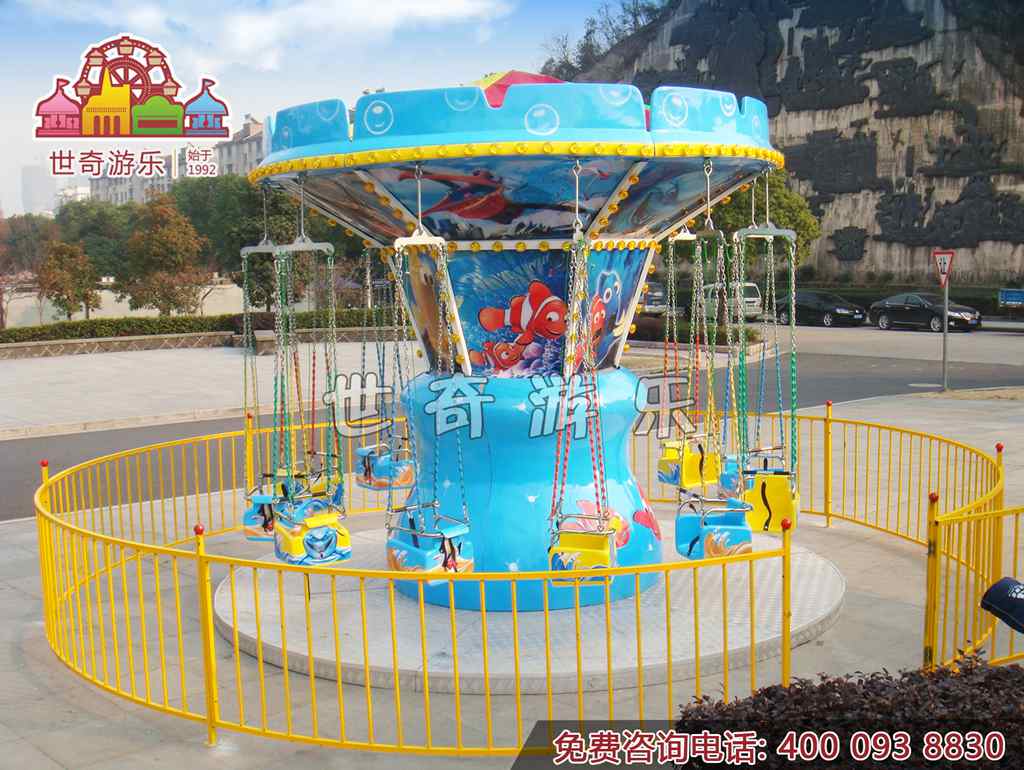 海洋小飛椅是在兒童飛椅和旋轉(zhuǎn)飛椅的基礎(chǔ)上精心改良的一款中小型兒童游樂設(shè)備。以神秘的海洋做為背景,又將神秘、優(yōu)美的美人魚;人類的好朋友——調(diào)皮的海豚,可愛的海螺、海馬、小貝殼等等海洋生物呈現(xiàn)在在家眼前,加上傾斜、起伏的運(yùn)動(dòng)軌跡設(shè)計(jì),帶領(lǐng)著大家漫步在海洋之中,以海豚為伴,以美人魚為友,感覺著海洋的無窮魅力和擋不住的吸引力。
