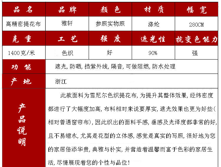公司經營:陽離子半遮光、亮絲遮光布、各類條紋遮光布、麂皮絨遮光布、提花遮光布、印花遮光布、工程提花布、色織提花布、雪尼爾、工程窗紗等裝飾布,適用于家紡、窗簾等裝飾。