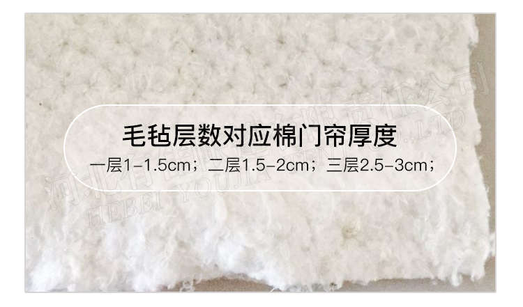 1.外層防火布多種顏色可選,內芯是毛氈或防火巖棉。毛氈一層1-1.5cm;二層1.5-2cm;巖棉都是一層的,沒過機器是10cm,做好后是3-4cm。