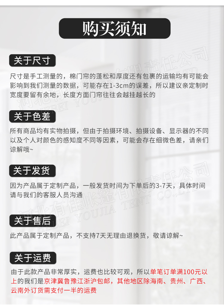 2.窗口常規尺寸為30*40=20/個 帶框窗口30*40=25/個 40*50=30/個其他尺寸窗口= 100元/平米,門簾寬度超過 1.8米的加窗口必須是加帶框的。