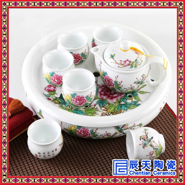 景德鎮(zhèn)市辰天陶瓷有限公司專業(yè)生產(chǎn)定做各類陶瓷茶具,造型多樣,工藝精美?蛻粢部筛鶕(jù)自己想要的圖案文字等來樣定做。