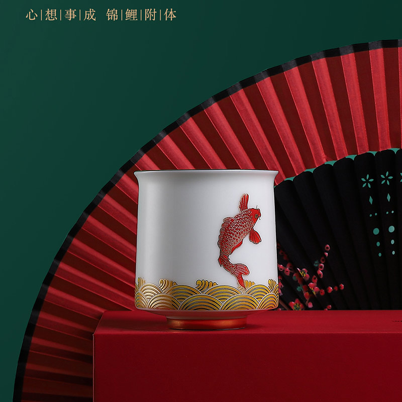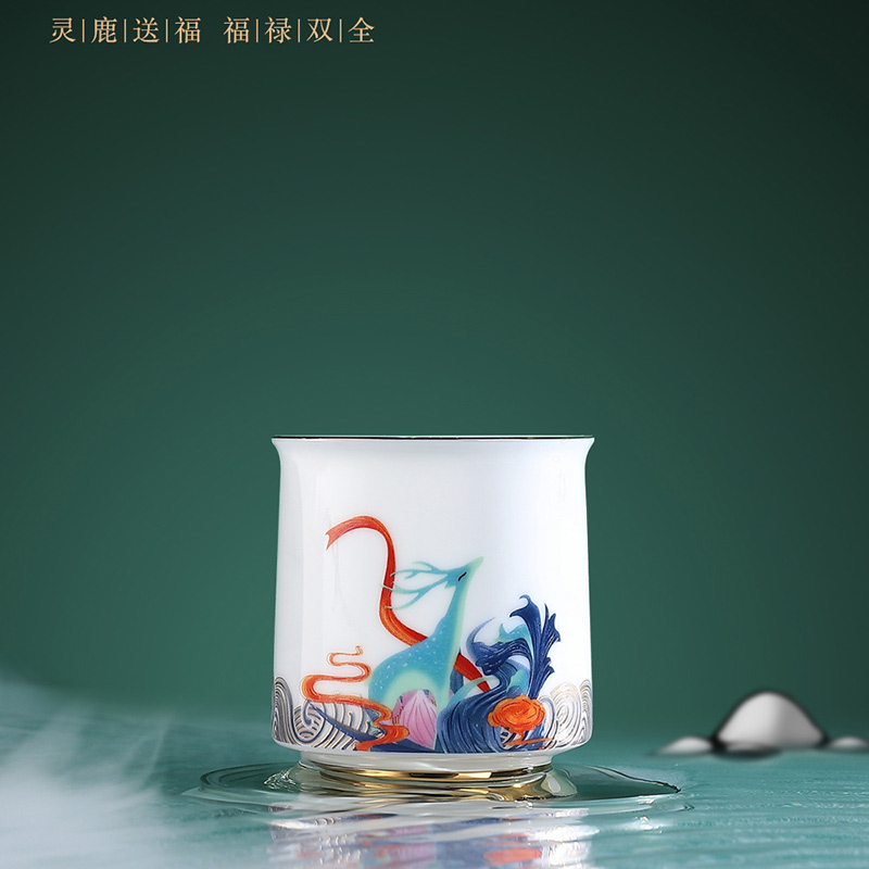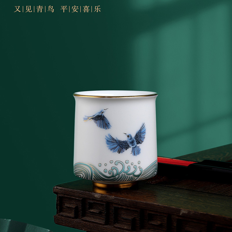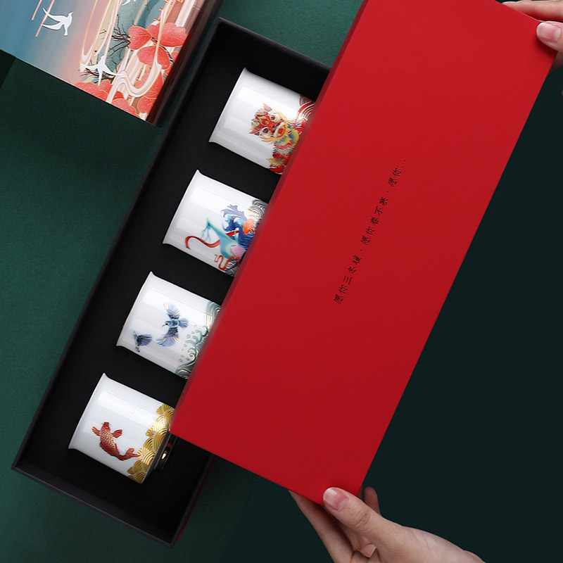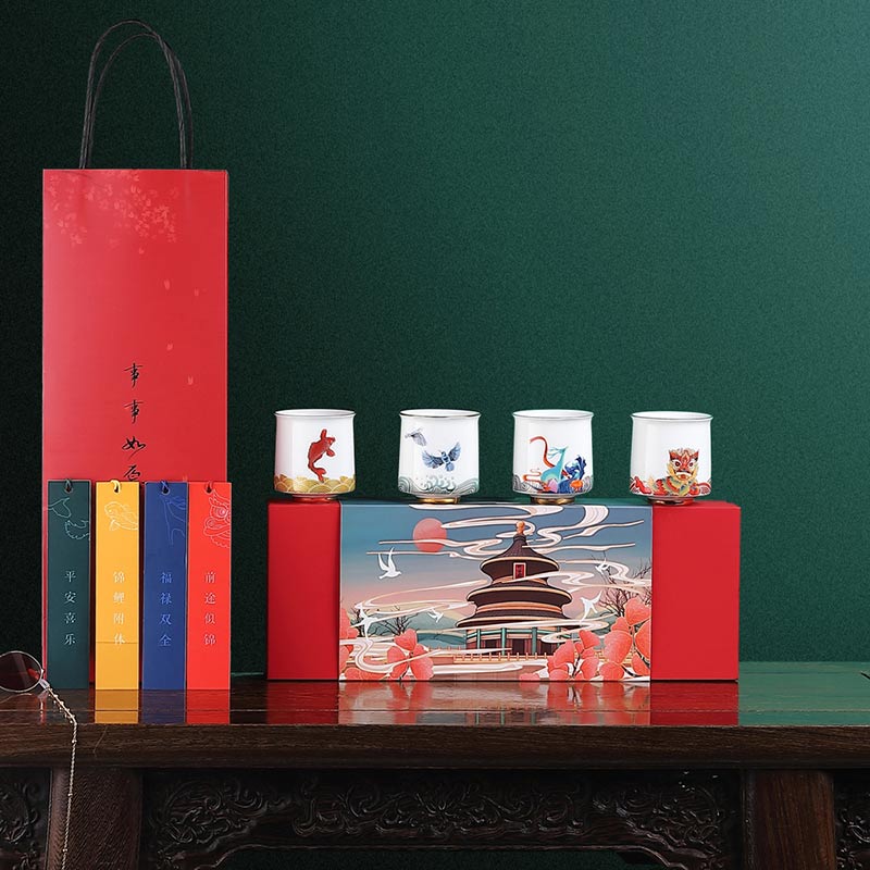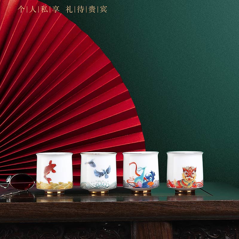 事事如愿主人杯是四個杯套裝,杯身圖案有青鳥、錦鯉、靈鹿、武師;又見青鳥,平安 喜樂;靈鹿送福,福祿雙全;心想事成,錦鯉附體;未來可期,前程似錦。這款事事如愿主人杯套裝其寓意非凡,屬古風潮流、事事如愿、美麗自內而外。瓷質細膩通透,胎薄如紙,選用高白瓷羊脂釉玉瓷。送禮自用都是佳品。