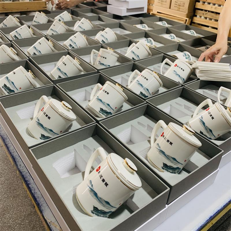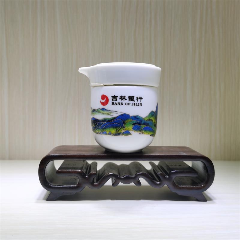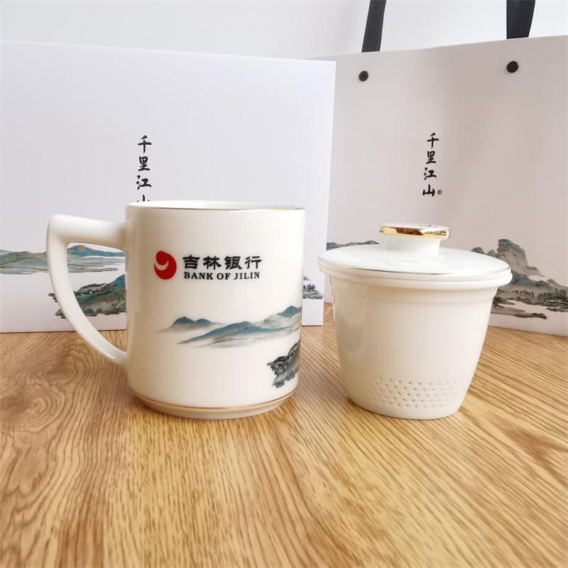 銀行禮品陶瓷茶杯定做廠家,銀行辦公禮品千里江山圖茶杯印標