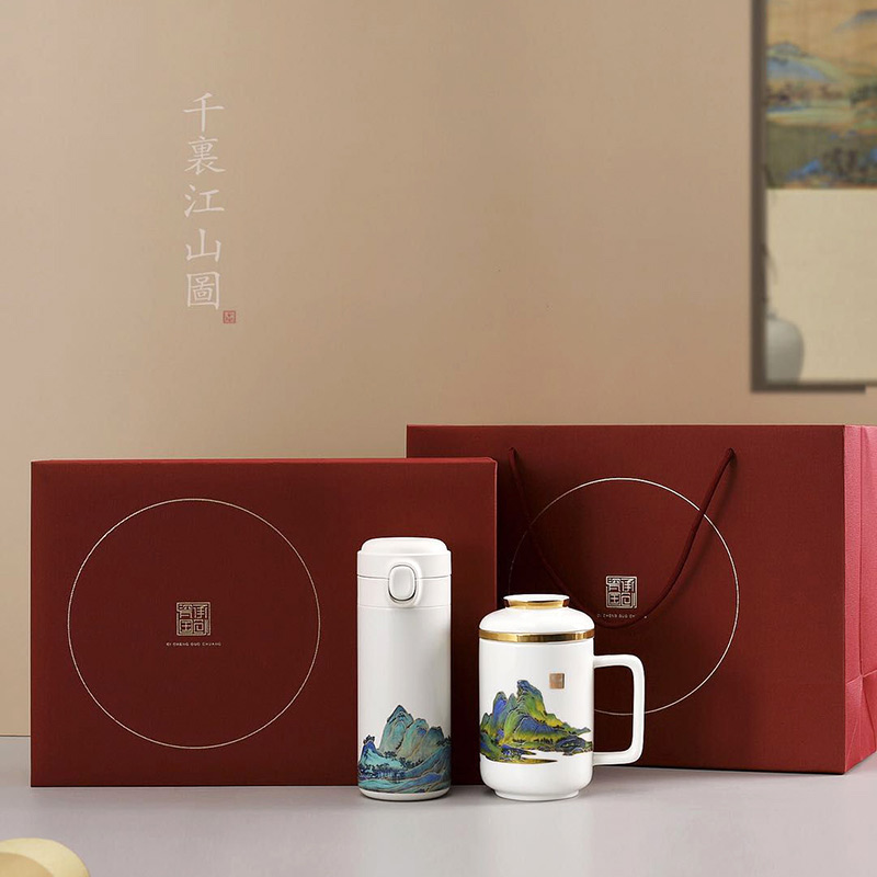 今天為大家介紹的這款銀行禮品定做的陶瓷茶杯是名為千里江山圖的禮品茶器套裝,其設計靈感來源于北宋《王希孟》的千里江山圖,千里江山圖現藏于北京故宮博物館。原創版權、專利設計?钍接校呵Ю锝綀D茶具套組、千里江山圖茶杯茶葉罐套裝,千里江山圖過濾主人杯、千里江山圖宮帽杯旅行茶具、千里江山圖個人杯保溫杯套裝,千里江山圖同心杯保溫杯套裝,千里江山圖過濾思逸杯禮盒裝,千里江山圖保溫杯旅行茶具套組等。產品材質是頂級瓷泥羊脂玉釉高溫瓷,經過高溫1320度以上燒制而成。不褪色不變色,使用安 全環保,易清洗。銀行禮品定做陶瓷茶杯可以根據不同客戶群體選擇不同的款式,可以定制銀行logo,宣傳標語、文字等,也可以按照客戶的要求改版定制圖案。