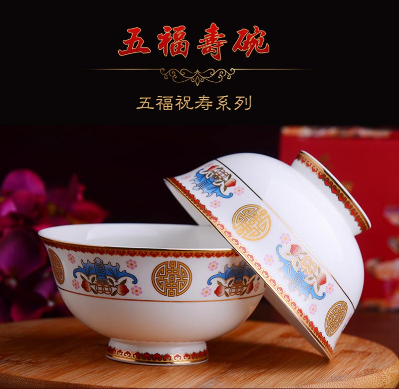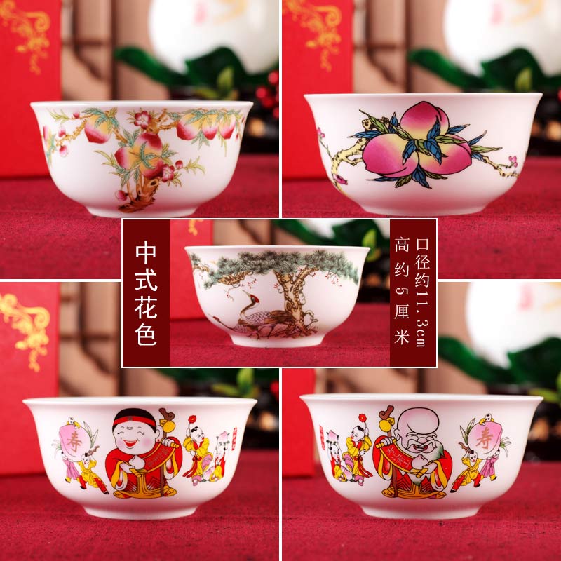 壽宴定制壽碗廠家生產的陶瓷壽碗都是具有很高的紀念意義,都是經過高溫燒制,可以長久保存不褪色。壽宴定制壽碗廠家的陶瓷壽碗款式多種、畫面豐富、規格齊全,常規尺寸4.5英寸、5英寸、6英寸、9英寸等。壽碗的畫面有“福如東海、壽比南山、百壽圖、福壽康寧、長命富貴、紅燈籠、壽公壽婆、松鶴延年、九桃、仙鶴、松鶴同輝、萬壽無疆、中國紅龍鳳福壽”等。