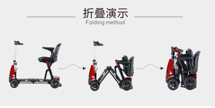 折疊代步車整體設計極具現代休閑氣息,安 全舒適,操作簡單,折疊攜帶,輕便穩固。一步式折疊連動系統或遙控伸縮系統,3s收折/展開,可放入小車后備箱。讓智能折疊老人代步車一步式折疊連動系統3秒收折/展開