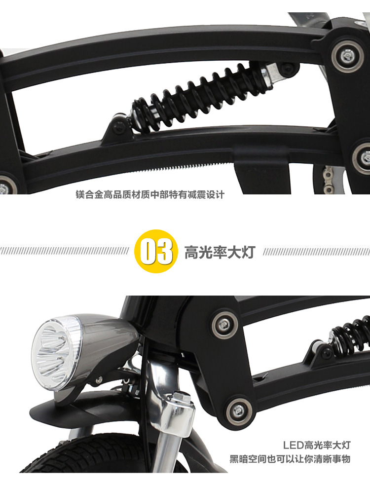 鎂合金車架、正新輪胎、前后羅拉剎車、自動一秒折疊、1∶1助力系統(tǒng)、直筒液壓前減中心減震、鎂合金前叉、電動35—40km、1∶1腳踩助力55—70km、36v9ah鋰電池、毛重/凈重 28/24kg |