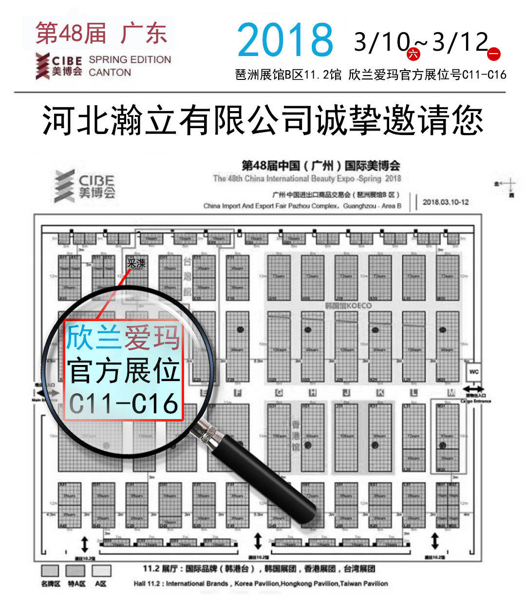 2018年3月第48屆中國廣州國際美容博覽會將于在廣交會展覽館舉行,我司與兄弟公司采潗誠邀您一同襄盛舉。(我司展位號11.2 館 c11-c16。)