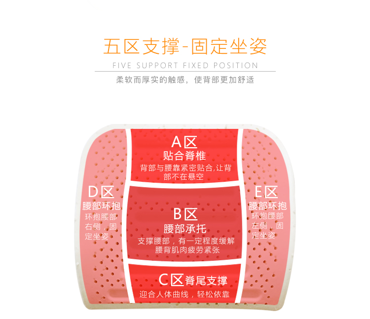 腰靠結構主要是起到托扶、支撐腰椎的作用。脊柱骨是s型的,在腰部是呈現曲形狀,腰靠符合腰椎結構的支撐模塊,而且乳膠本身具有高彈性,起到很好的支撐力,有效緩解疲勞,適合不同體重的人群。