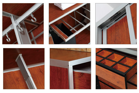 ②采用高精級鋁合金與aep環保板材和諧共融,無任何氣味,托板及服裝掛件高低任意調整,組件可隨意增加或減少,滿足現代人性化設計使用。