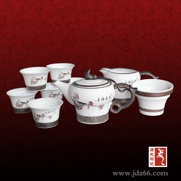 唐龍?zhí)沾勺鳛橐患抑哺谇甏啥季暗骆?zhèn)的陶瓷企業(yè),是一家集產(chǎn)品設(shè)計、開發(fā)、制造、包裝等整套工藝流程為一體的景德鎮(zhèn)功夫茶具生產(chǎn)廠家。我公司生產(chǎn)的景德鎮(zhèn)功夫茶具造型新穎、品種繁多、風(fēng)格獨特。也可以根據(jù)您的需要印制您需要的各種圖片、添加公司logo圖形和文字等。