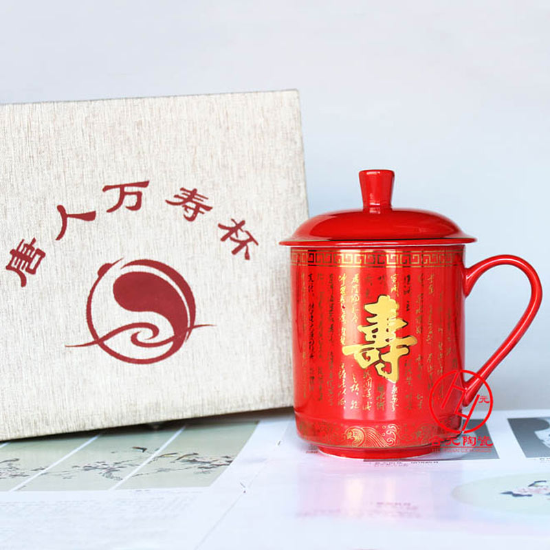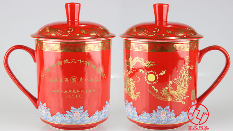 景德鎮合元陶瓷廠生產的一款中國紅壽杯深受大眾喜愛,此款中國紅陶瓷壽杯采用是優質骨質瓷為原料,壽杯身的圖案采用金色,有龍鳳圖案后者定制百壽字,畫面都是可以根據客戶要求定制,百歲壽辰回禮壽杯大部分是贈送對杯,選用精美禮盒或者錦盒包裝,一份gao檔的壽辰禮品。