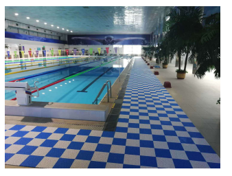 2.游泳池防滑場地允許的情況下可以拼出任意圖案大觸面,底部多個支柱,與地面水漬隔離,表面有漏水線條,防止因地面積水而產生的滑倒。