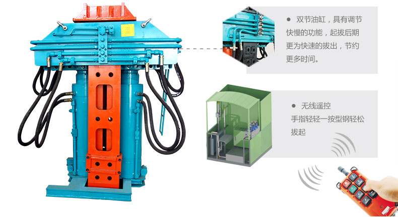 1. 一體式起吊設計雙節油缸,具有調節快慢的功能,起拔后期更為快速的拔出,節約更多時間。