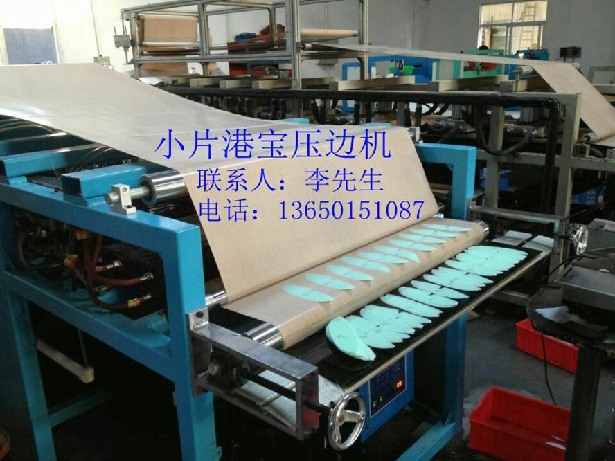 3、港寶小片壓邊成型機(jī),生產(chǎn)流程:刀模先裁好小片,再經(jīng)過壓邊機(jī)加熱壓邊或輥壓使小片周邊壓薄,然后經(jīng)過冰 水冷卻,輸送到后面自動缷料,一雙一雙的周圍薄的好像削邊的港寶小片就加工出來了。