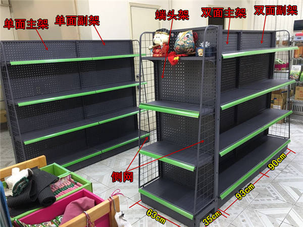 1.美觀大方、結構牢固、規格多樣、任意組合;設計造型具有時代氣派,超市貨架是單雙面貨架可以相互結合.層間距可任意調節;