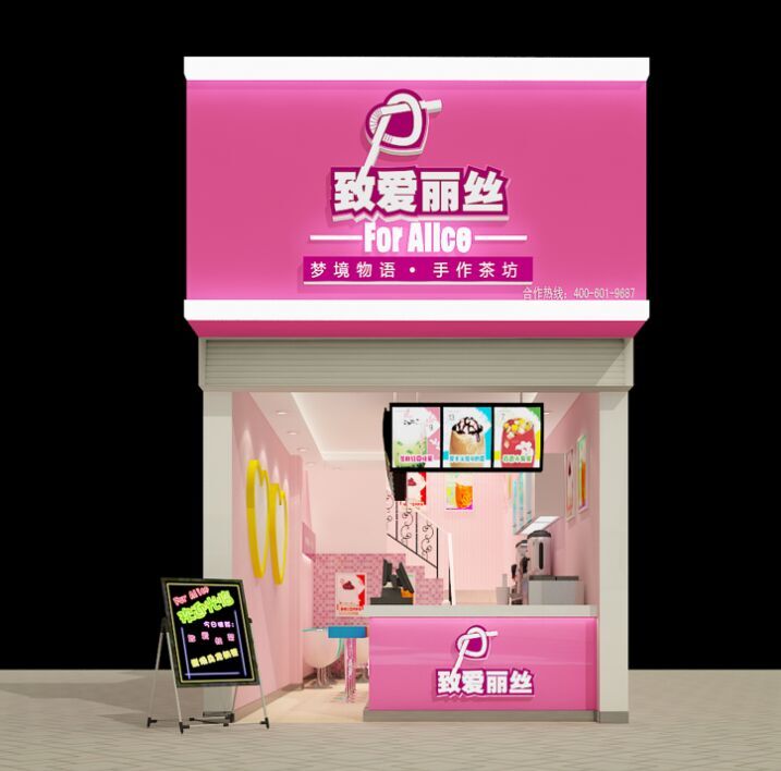 個性的黑色、神秘的紫色和浪漫的玫紅色作為“致愛麗絲”店面設(shè)計的主色調(diào),三種顏色的完美搭配再加以粉 紅色相點綴,給人時尚浪漫甜蜜的感覺,和“致愛麗絲”的品牌文化遙相呼應(yīng),好像真的進(jìn)入了一個甜蜜的美麗仙境,在這樣甜蜜的環(huán)境氛圍里喝茶,肯定會有一種非常愜意的感覺。這樣漂亮的環(huán)境,也肯定會有不少的男生在這里向心愛的女生表白。門頭logo上的心型吸管和圍繞吧臺一周的心型貼紙等細(xì)微之處的設(shè)計,無不體現(xiàn)著“致愛麗絲”的可愛和用心,時刻給人精致時尚的感覺。