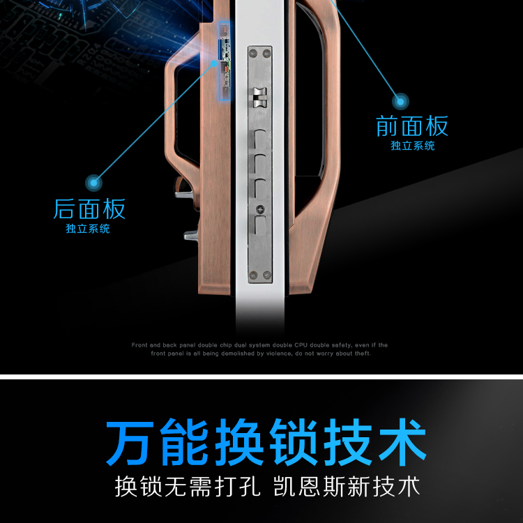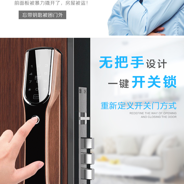 凱恩斯全自動滑蓋高端指紋鎖的開門是不用壓把手的,全自動開門,輕輕一按即可全自動上鎖,開門、關門更人性、更便捷;全自動高端智能鎖具有防貓眼開啟功能,因為把手是鎖定的,不可轉動開門,從根本上杜 絕從貓眼開門的可能性;智能鎖具有亂碼功能,可在正確密碼前后隨意添加數字,防止密碼被人窺竊;通配市面上95%的國標、非標鎖體;智能鎖擁有禁試功能,連續認證錯誤5次,系統會自動報警并且鎖定,防止別人不停的驗證,更加保障您的財產安 全。