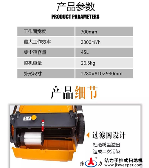 jl700 手推式掃地機(jī)是結(jié)力公司推出并擁有自主知識產(chǎn)權(quán)的升級產(chǎn)品。該產(chǎn)品在現(xiàn)有無動力掃地機(jī)自然除塵排氣的基礎(chǔ)上,增加了機(jī)械除塵排氣裝置,將掃地機(jī)工作時垃圾箱內(nèi)形成的粉 塵氣體強(qiáng)制過濾排除箱外,還有效解除了粉 塵溢出的二次污染問題。