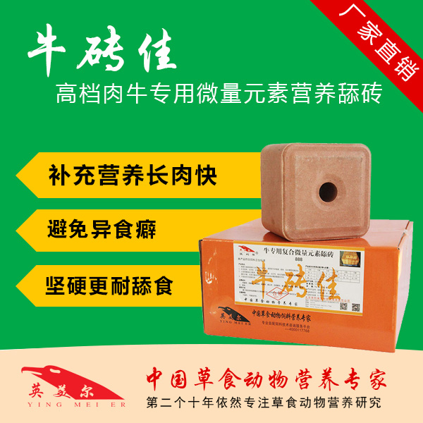 國內第一款牛專用的微量元素 舔磚-英美爾牛磚佳,采用全自動化生產線,參考農業部肉牛飼養標準的微量元素 需求量而設計,舔磚消耗速度正好滿足肉牛日常微量元素 需求,不會因為舔食太快而提高飼養成本;也不會因為舔食過慢而無法滿足營養需求,是國內目前效果最好的牛專用舔磚。