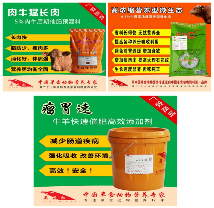 英美爾肉牛育肥期專用預(yù)混料【肉牛猛長肉-5%肉牛復(fù)合預(yù)混料】,可以足300公斤以后的育肥牛的生長速度,提高日增重,提高飼料轉(zhuǎn)化率,給