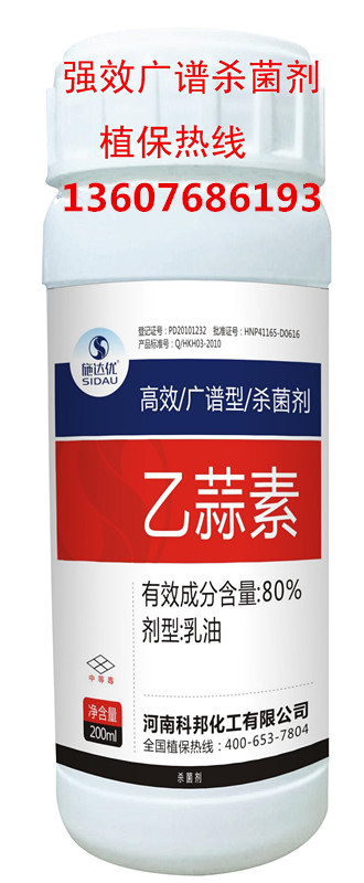 本品特點:廣譜內吸性高效殺菌劑 ,對植物因真菌、細菌引起的各種病害具有當天抑制,三天治療徹底的獨特效果。乙蒜素 是無公害蔬菜的首選產品,可促進農作物生長、增產增收.產品為速效、高效、廣譜、內吸性殺菌劑 ,安 全無抗性、降解無殘留,活性高、用量少,具有預防、保護、治療、調節、補養五大功。而且能夠激活植物細胞,促根壯苗,保花保果,治療死苗爛根等效果,為現代農業應用的主導品牌。乙蒜素 主要防治蔬菜、水稻、玉米、瓜果、茶葉、花卉、草莓、藥材等作物的稻瘟病、惡苗病、水稻紋枯病,稻曲病,稻粒黑粉 病,鞘腐病 ,銹病、葉枯病、枯萎病、黃萎病、立枯病、疫病、青枯病、蔓枯病、炭疽病,苗期立枯病、猝倒病、根腐病、角斑病、緣枯病、瘡痂病、軟腐病、黑腐病、黑斑病、細菌性葉斑病、死苗死棵等病害,是綠色蔬菜的首先產品。