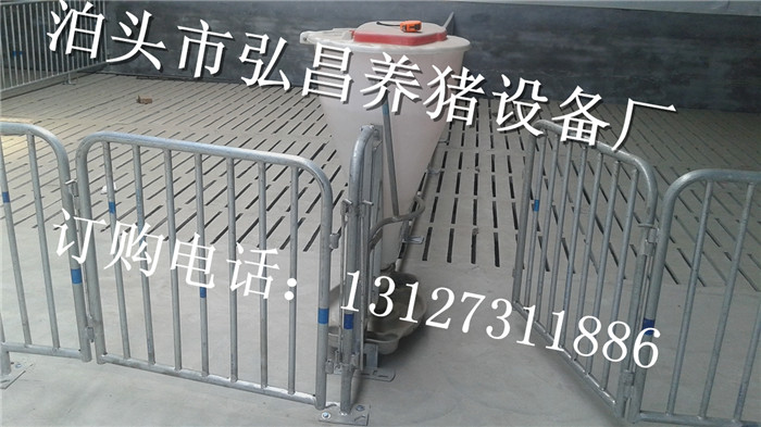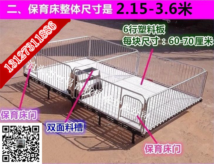 仔豬保育床采用工程聚丙塑料材質漏糞板,圍欄6分管、鋼筋焊接,配備料箱,水嘴。