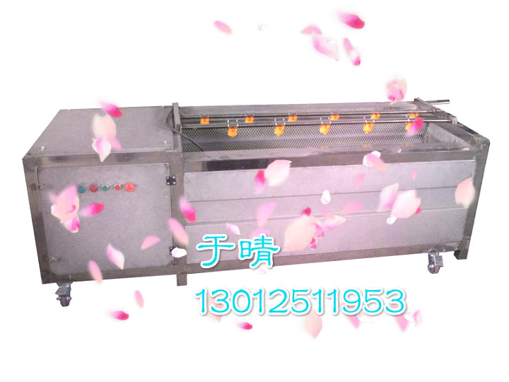 本機工作時,是將根莖類蔬菜或球類果品放置在幾根可滾動的毛刷輥上在組成的u型料斗里使物料與旋轉的毛刷輥接觸產生表面摩擦,清水從噴淋水管中噴出沖洗物料,從而達到洗凈的目的。