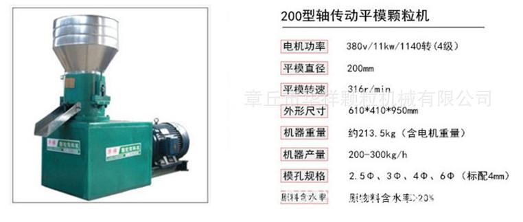 200型軸式飼料顆粒機:產量250-300kg/h,電機功率:11kw  4級